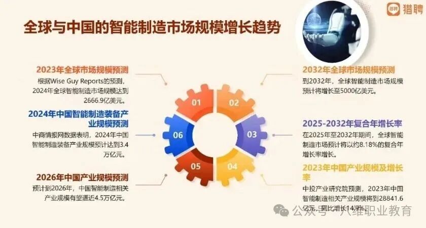 獵聘《2025年智能制造領(lǐng)域人才供需洞察報(bào)告》信息顯示,中國智能制造業(yè)在政策支持、市場體量、技術(shù)發(fā)展等多方面因素影響下,有望在2030年前躋身行業(yè)第一梯隊(duì)。預(yù)測2025年行業(yè)規(guī)模將突破5萬億元,未來十年復(fù)合增長率保持12%-15%。