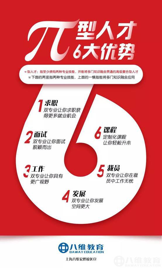 雙專業(yè)使學(xué)生在面試時(shí)能脫穎而出。市場(chǎng)調(diào)查顯示,具有一項(xiàng)專業(yè)技能,并在另外領(lǐng)域有特長(zhǎng)的復(fù)合型人才在面試中更加具有競(jìng)爭(zhēng)優(yōu)勢(shì),企業(yè)更加青睞。學(xué)同樣專業(yè)的學(xué)生去同一家企業(yè)面試,具有雙專業(yè)的八維π型人才因?yàn)槎囗?xiàng)能力加持,在面試時(shí),能做到從容自信、對(duì)答如流,從而能夠一面而就,輕松拿到offer。