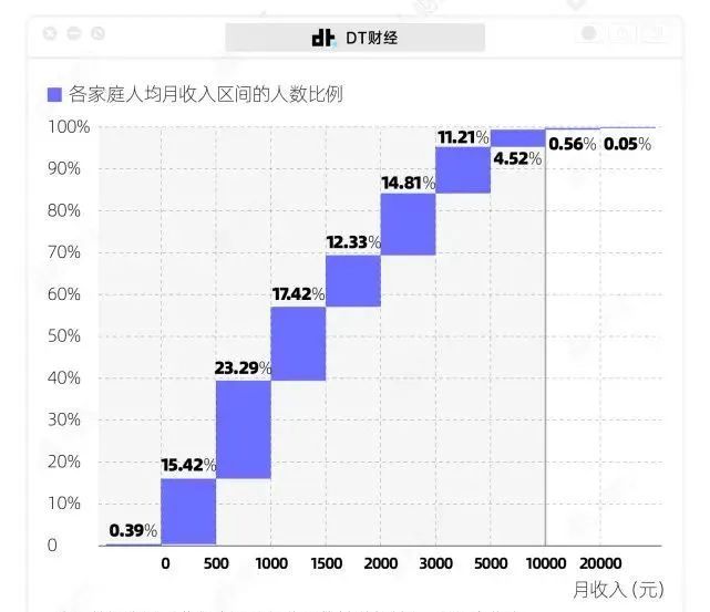 北京師范大學(xué)中國收入分配研究院發(fā)布的一篇調(diào)查數(shù)據(jù)顯示:我國人均可支配月收入(扣除個(gè)人所得稅等之外可用于實(shí)際使用的可支配收入)在10000元以上的家庭占比僅為0.61%。換言之,家庭人均可支配收入過萬意味著超過了全國99%的家庭。