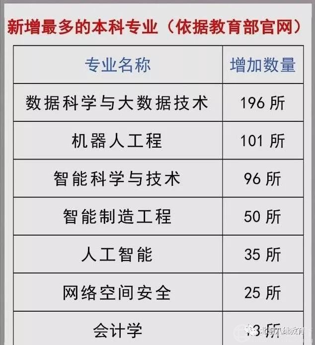 新增數(shù)量最多的7個(gè)專業(yè)分別是數(shù)據(jù)科學(xué)與大數(shù)據(jù)技術(shù)、機(jī)器人工程、智能科學(xué)與技術(shù)、智能制造工程、人工智能、網(wǎng)絡(luò)空間安全和會(huì)計(jì)學(xué)。除了會(huì)計(jì)學(xué),其他新增的6個(gè)專業(yè)都與智能、人工智能緊密相連。
