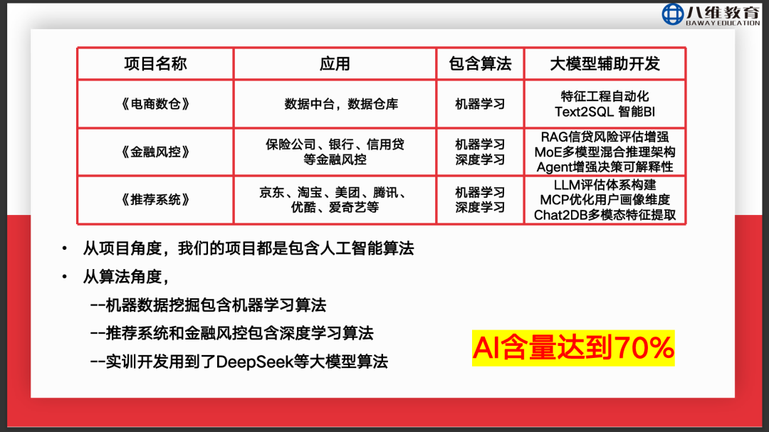 培養(yǎng)實(shí)戰(zhàn)能力是八維教育的重中之重。在實(shí)戰(zhàn)能力培養(yǎng)中,項(xiàng)目是核心基礎(chǔ)。因此,在大數(shù)據(jù)專(zhuān)業(yè)中,學(xué)子能沉浸式學(xué)習(xí)并實(shí)操三大真實(shí)企業(yè)項(xiàng)目——《電商數(shù)倉(cāng)》、《金融風(fēng)控》、《推薦系統(tǒng)》,將實(shí)戰(zhàn)技能提升一個(gè)臺(tái)階,實(shí)現(xiàn)技能“質(zhì)”的飛躍。通過(guò)引入企業(yè)真實(shí)項(xiàng)目,讓學(xué)生參與到其中,“項(xiàng)目驅(qū)動(dòng)式”的學(xué)習(xí)能夠助力學(xué)生在畢業(yè)前就積累下寶貴的實(shí)踐經(jīng)驗(yàn)。另外,依托于八維與眾多知名企業(yè)達(dá)成戰(zhàn)略合作,學(xué)生不僅能在課堂上接觸真實(shí)項(xiàng)目,還能在課下走進(jìn)名企,感受科技的力量。