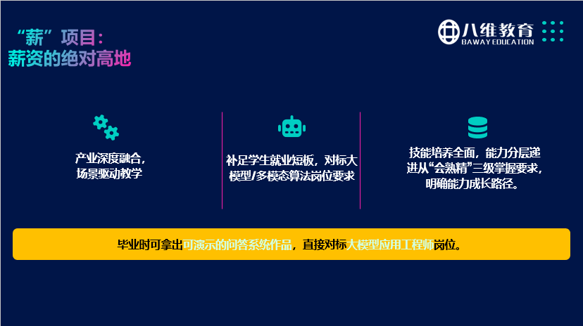 課程設(shè)置針對(duì)性極強(qiáng),系統(tǒng)化補(bǔ)足從算法優(yōu)化、工程部署到系統(tǒng)工程能力等關(guān)鍵技能短板,使學(xué)生具備解決復(fù)雜問(wèn)題的“即戰(zhàn)力”,崗位對(duì)人才需求的技術(shù)能力。簡(jiǎn)而言之,八維培養(yǎng)的不僅是基礎(chǔ)的應(yīng)用者,更是能解決復(fù)雜問(wèn)題、具備完整項(xiàng)目能力的高端開(kāi)發(fā)工程師,讓學(xué)子市場(chǎng)價(jià)值倍增。