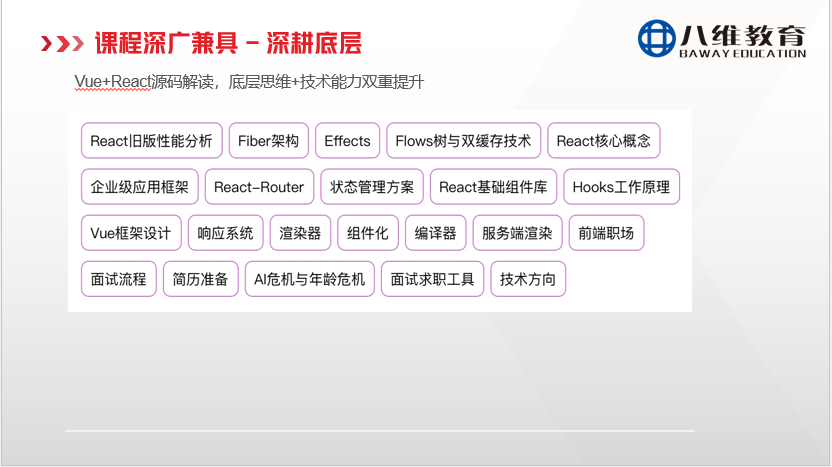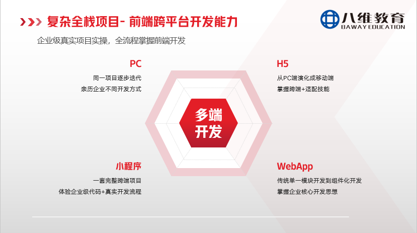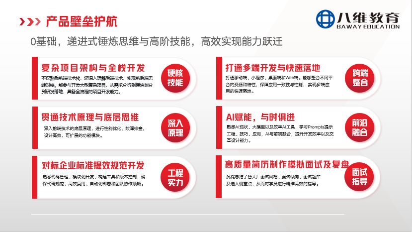無論環(huán)境如何變化,前端高級工程師始終是各大公司爭搶的核心人才。八維大學(xué)生短訓(xùn)將致力于全方位打造“技術(shù)成長和職業(yè)破局”的雙高體系,深度打通“全棧+全流程+多端+工程化+AI賦能”,全面培養(yǎng)能夠“駕馭全局、深廣兼?zhèn)洌蛲ǘ喽巳珬?rdquo;的高級工程師,將每位學(xué)員鍛造成企業(yè)競相追逐的稀缺性人才。