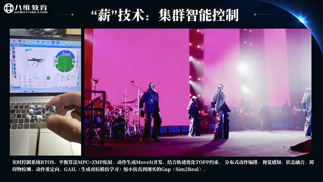 實(shí)現(xiàn)多無(wú)人機(jī)協(xié)同作業(yè),并延伸至機(jī)器人、機(jī)器狗等具身智能設(shè)備。涉及實(shí)時(shí)控制系統(tǒng)、平衡算法等技術(shù)。