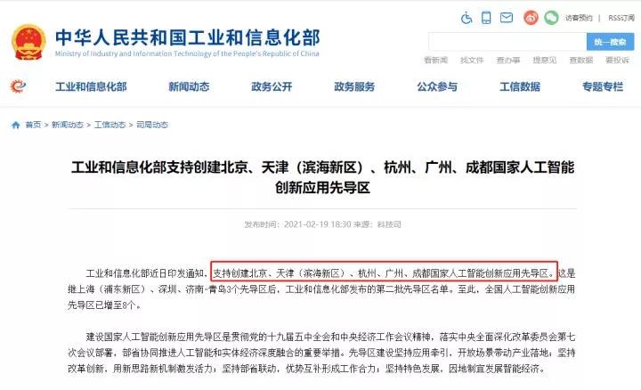 工業(yè)和信息化部近日印發(fā)通知,支持創(chuàng)建北京、天津(濱海新區(qū))、杭州、廣州、成都成立國(guó)家人工智能創(chuàng)新應(yīng)用先導(dǎo)區(qū)。這是繼上海(浦東新區(qū))、深圳、濟(jì)南-青島3個(gè)先導(dǎo)區(qū)后,第二批成立的先導(dǎo)區(qū)。至此,全國(guó)人工智能創(chuàng)新應(yīng)用先導(dǎo)區(qū)已增至8個(gè)。