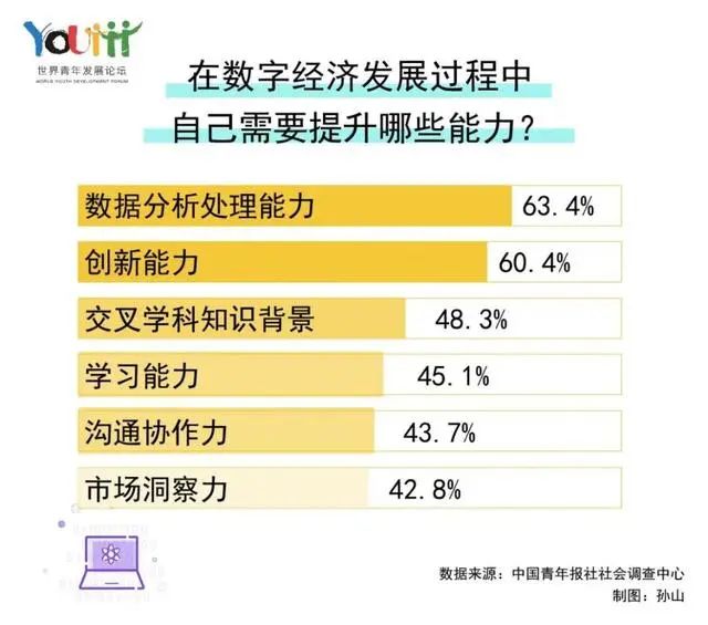 調(diào)查了解到,多數(shù)年輕人認(rèn)為自身諸多方面能力尚有不足,仍急需提升。其中,數(shù)據(jù)分析處理能力(63.4%)、創(chuàng)新能力(60.4%)和交叉學(xué)科知識(shí)背景(48.3%)位于前三位。在此次“青年與數(shù)字經(jīng)濟(jì)”的調(diào)查中,受訪者00后占33.3%,90后占45.4%,80后占21.3%。