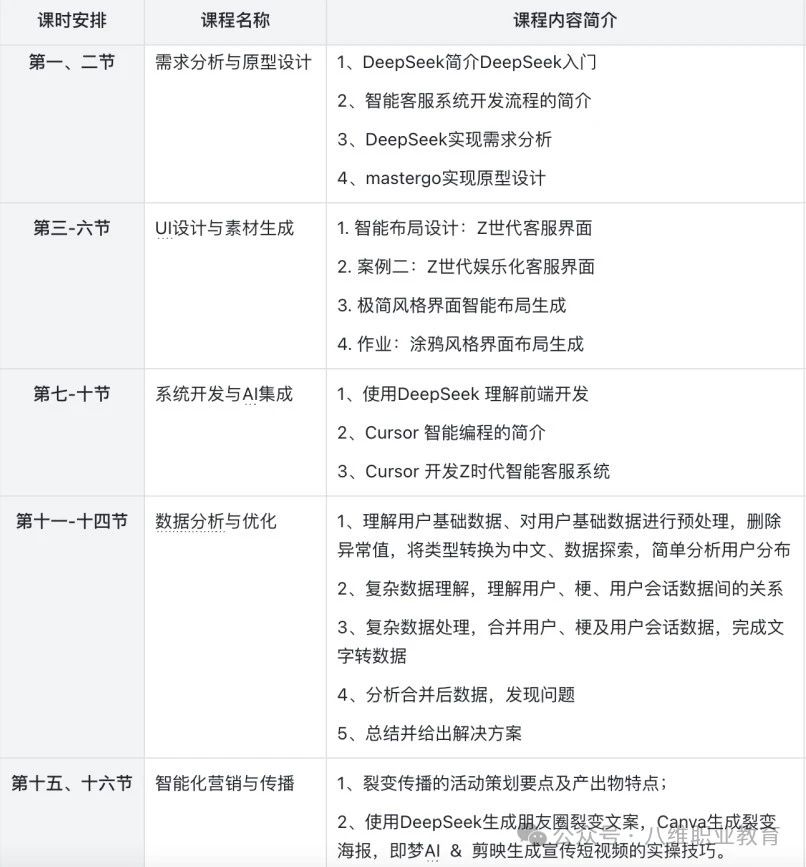 本門課由八維研究院各個(gè)方向的技術(shù)專家精心打造完成,手把手教你用DeepSeek+MasterGo+Cursor+ ChatExcel+Canva+即夢(mèng)AI實(shí)現(xiàn)智能客服項(xiàng)目的需求分析與原型設(shè)計(jì)、UI設(shè)計(jì)與素材生成、系統(tǒng)開發(fā)與AI集成、數(shù)據(jù)分析與優(yōu)化、智能化營(yíng)銷與傳播的開發(fā)運(yùn)營(yíng)全鏈路流程。