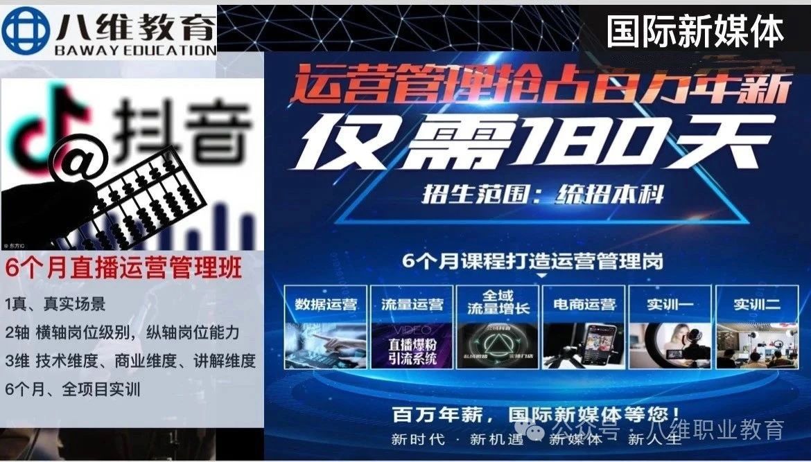 八維國(guó)際新媒體專業(yè),直擊核心痛點(diǎn)——流量獲取與轉(zhuǎn)化!聚焦培養(yǎng)稀缺“流量運(yùn)營(yíng)高級(jí)優(yōu)化師”,讓你成為掌控GMV的“幕后操盤手”,薪資優(yōu)厚,晉升快人一步!