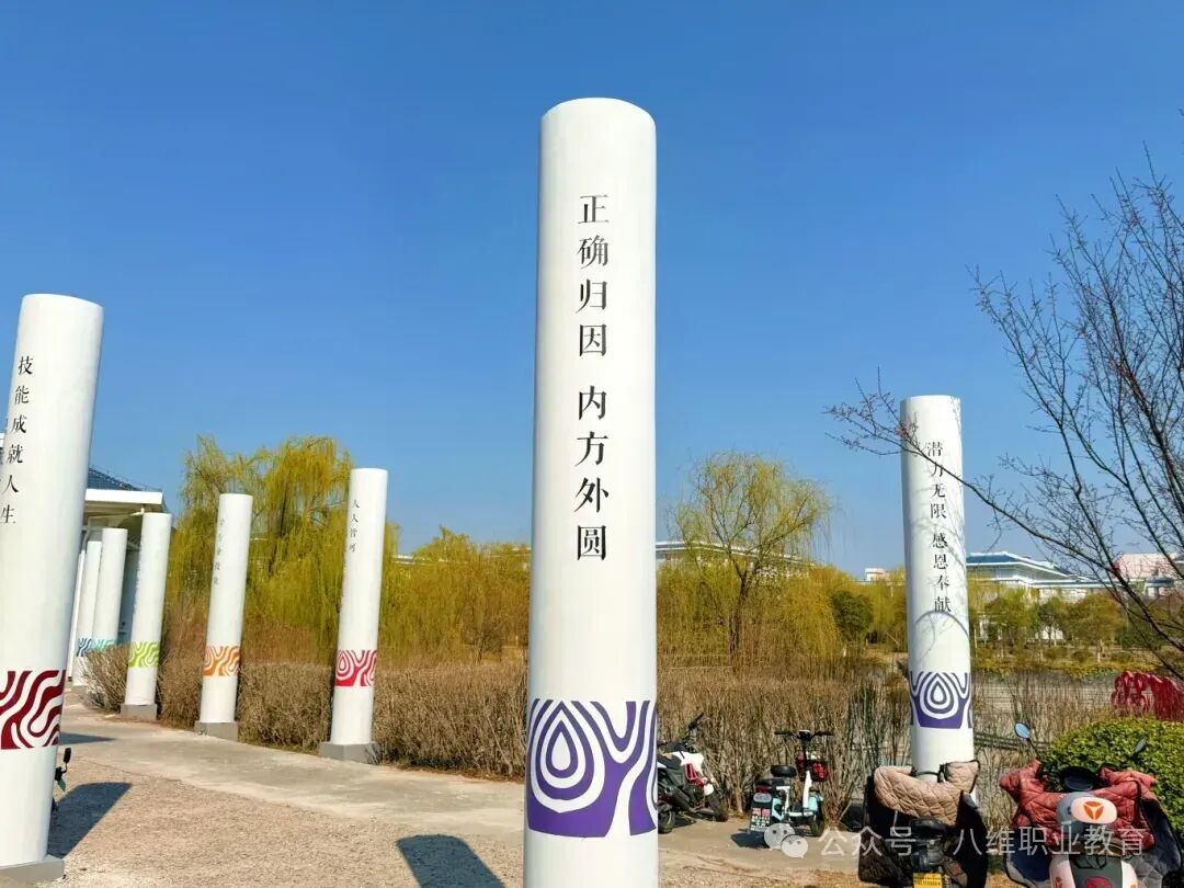 文化景觀柱林立在校園西北角,一共14根。這些立柱上,分別鐫刻著學院的辦學模式、行為理念、辦學愿景、教育理念等。