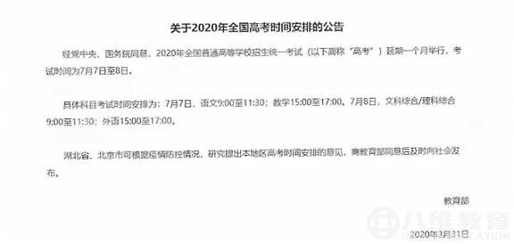 3月31日《關(guān)于2020年全國高考時間安排的公告》一經(jīng)發(fā)布,全國各大媒體都競相報道高考延期的消息,同時也刷爆了各大平臺,因為高考事關(guān)千家萬戶,更是牽掛著考生及家長的心。近期在網(wǎng)絡(luò)上流傳著這樣一個段子:得知高考延期后,學(xué)霸在想“我都復(fù)習(xí)好了,為什么要延期”;學(xué)渣在想“學(xué)霸又在無病呻吟了”;而我在想“完了,暑假沒了”。 2020年,全國高考報名人數(shù)達到1071萬,相比去年又增加了40萬人。既然高考延期已經(jīng)板上釘釘,那么作為高中畢業(yè)生你應(yīng)該怎樣應(yīng)對呢?