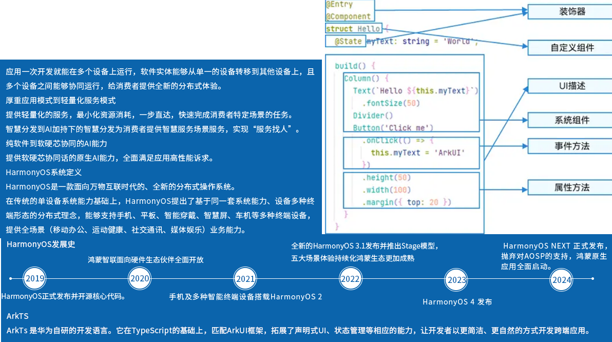 基于HarmonyOS NEXT (4.0) 版本,學(xué)習(xí)鴻蒙應(yīng)用開發(fā)主流語 言ArkTS語言,具備鴻蒙OS應(yīng)用 設(shè)計(jì)開發(fā)能力。(保薪) 掌握ArkTS語法,即聲明式語法、 自定義組件、狀態(tài)管理、渲染控 制;(保薪) 掌握ArkUI核心能力,即布局、組 件、導(dǎo)航、圖形、動(dòng)畫、交互事 件;(保薪) 掌握HarmonyOS中WebView適 配開發(fā),即頁面加載、基本屬性 、事件、JS的使用、頁面跳轉(zhuǎn)和 導(dǎo)航、Cookie和請(qǐng)求響應(yīng)以及前 端頁面調(diào)試(保薪)