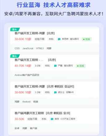 現(xiàn)在市場(chǎng)上鴻蒙工程師的招聘需求量很大,不是只有 華為公司招收鴻蒙工程師,其他大廠和公司對(duì)鴻蒙人 才的需求量也是急缺狀態(tài)。